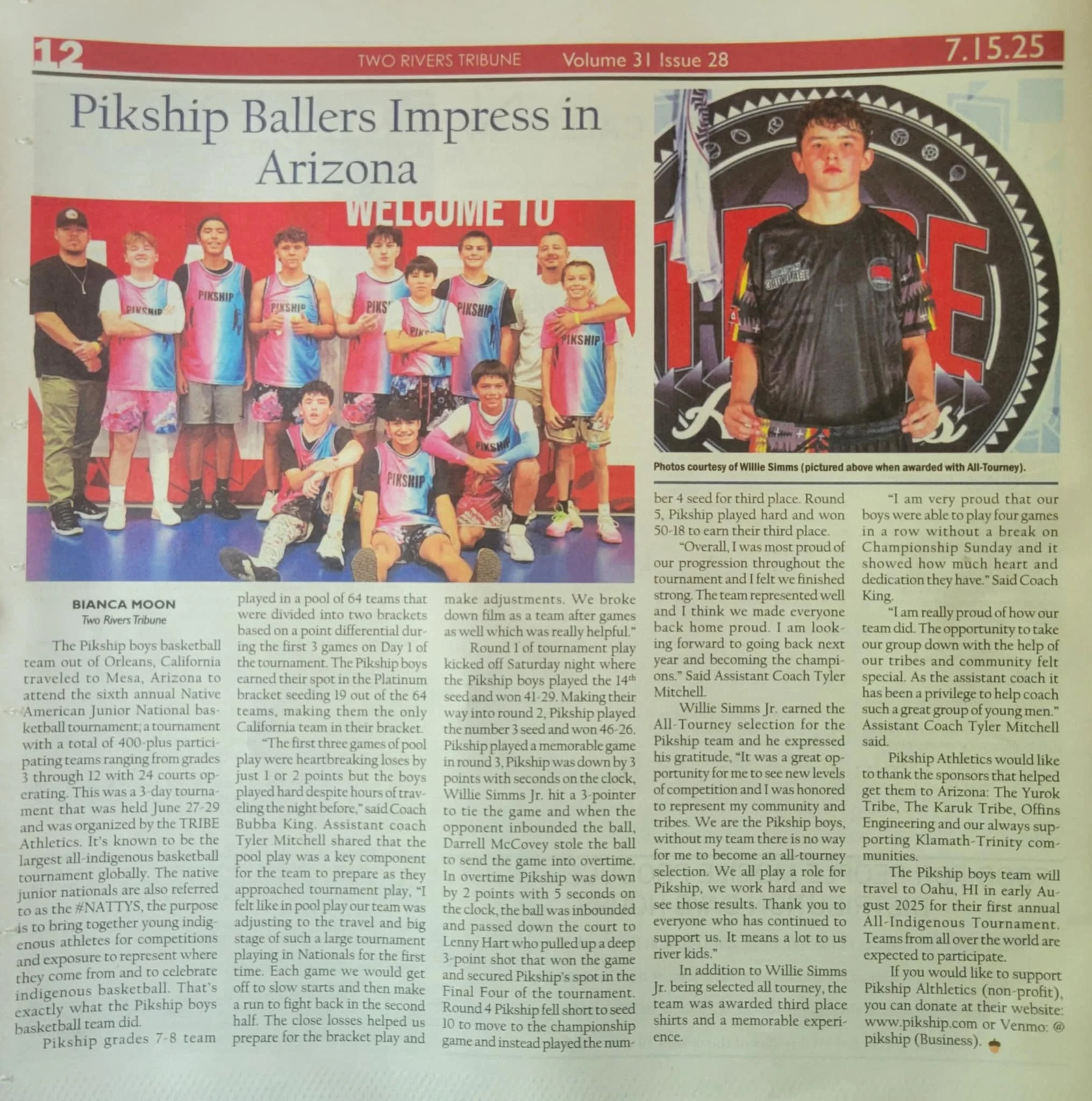 “The teams were fielded by Pikship Athletics, a nonprofit organization that engages youth in sports and other healthy activities in the Orleans, Weitchpec, Hoopa, and Willow Creek areas. Pikship Athletics sent 18 kids to nationals this year, where they competed in a field of 526 teams in the world’s largest indigenous basketball tournament.”
